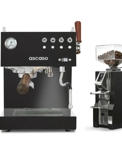 Built with top-of-the-line espresso assistance in mind, the Ascaso Steel Duo Plus and Eureka Mignon Libra Espresso Bundle features weight-based dosing and volumetric shot programming for more consistent and convenient espresso. The Ascaso Steel Duo Plus features espresso optimizations like a dual PID-controlled thermoblock layout, programmable preinfusion, and an adjustable OPV. The Eureka Mignon Libra builds a load cell into the portafilter hook, alowing for weight based dosing and gram-accurate grinding. Other bundled benefits; like a bevy of basket and portafilter options, an included dosing funnel, and walnut furniture makes the most of your home coffee setup.