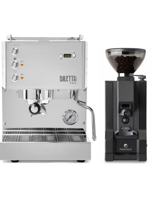 A match made in heaven; the DIletta Mio and Eureka Mignon Notte Bundle is exactly what you need to start out on your home espresso journey. This all-manual espresso combo brings together two handcrafted Italian machines: A modern-classic HX style espresso machine and a compact-yet-capable espresso grinder. With a little hands-on learning, you'll be grinding, brewing, and steaming like a barista in no time. Bundle includes a Diletta Mio (in your color of choice) and a Eureka Mignon Notte Espresso Grinder.