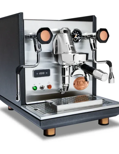 The ECM Synchronika espresso machine is widely considered to be the most refined dual boiler available in its price range. The Heritage Edition of this legendary piece of brewing equipment takes the same precision and build quality that established its dominance and presents it in an even more elevated package, complete with textured anthracite housing, copper accents, and knobs instead of joystick steam and hot water valves.